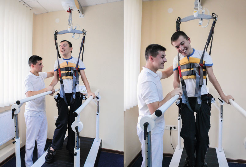 Формирование эффективной и качественной ходьбы является важной задачей реабилитации пациентов с моторными нарушениями, поскольку ходьба является не только основным актом локомоции человека, но и важной предпосылкой успешной социально-бытовой адаптации. Учитывая положительный мировой опыт, занятия на беговой дорожке были включены в интегральную систему интенсивной нейрофизиологической реабилитации по Методу проф. Козявкина. Основной задачей занятий на беговой дорожке является формирование у пациента шаговых движений, используя способность мозга учиться и генерировать необходимые импульсы к мышцам ног в ответ на правильные сенсорные стимулы. Сенсорные сигналы, возникающие при шаговых движениях, необходимые для формирования двигательного паттерна (схемы последовательного возбуждения нейронов, управляющих соответствующими мышцами при ходьбе).